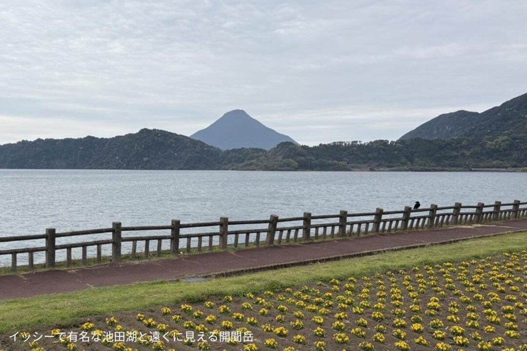 池田湖の奥には開聞岳も望めて、湖の周りには花も植えられています。満開の時期には花と湖と開聞岳のコラボが楽しめる、映えスポットになりそうですよ!
