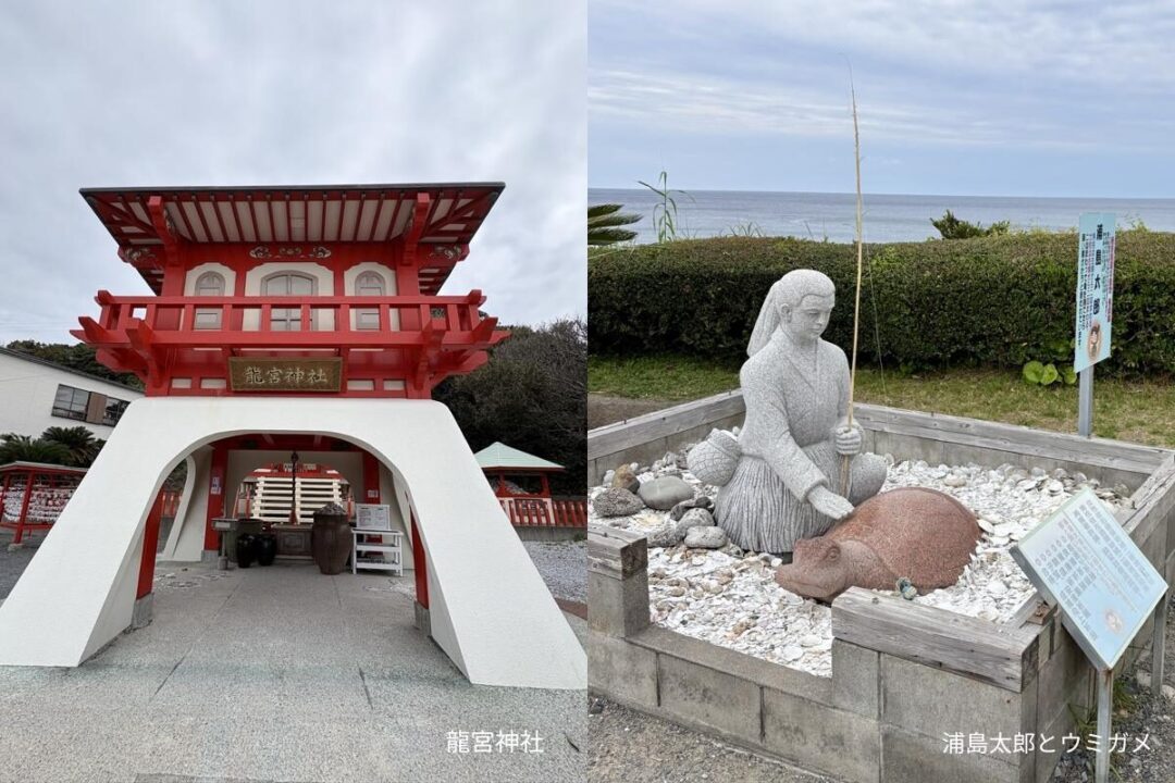 神社の先には浦島太郎とウミガメの像があります。男性は左回り、女性は右回りでウミガメの頭を撫でると願いが叶うとのこと。私たちも当然、くるりと回ってウミガメをなでなで。他の観光客の方々も同じように回っていて、なんだか微笑ましい光景でした。みんなの願いごと、叶うといいな(笑)
