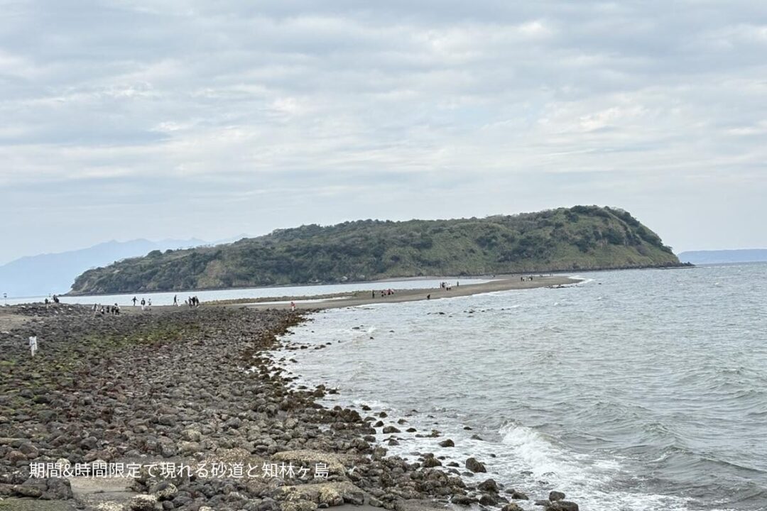 食後の観光は、干潮時だけ砂の道が現れ、島に渡れるという貴重なスポット、知林ヶ島へ。渡れる期間は3月〜10月、大潮または中潮の干潮時に限られるので、事前にネットで確認してから行くのがおすすめです。